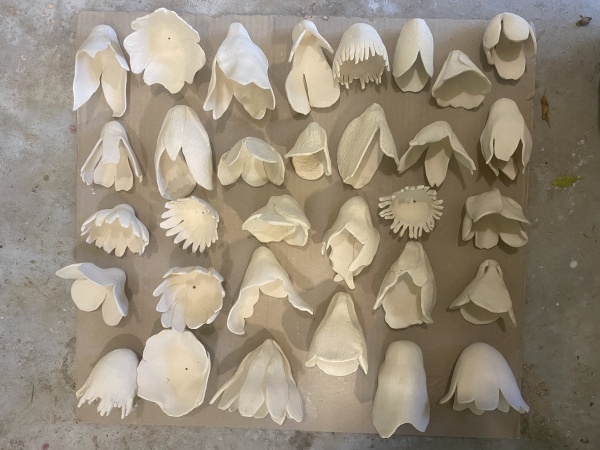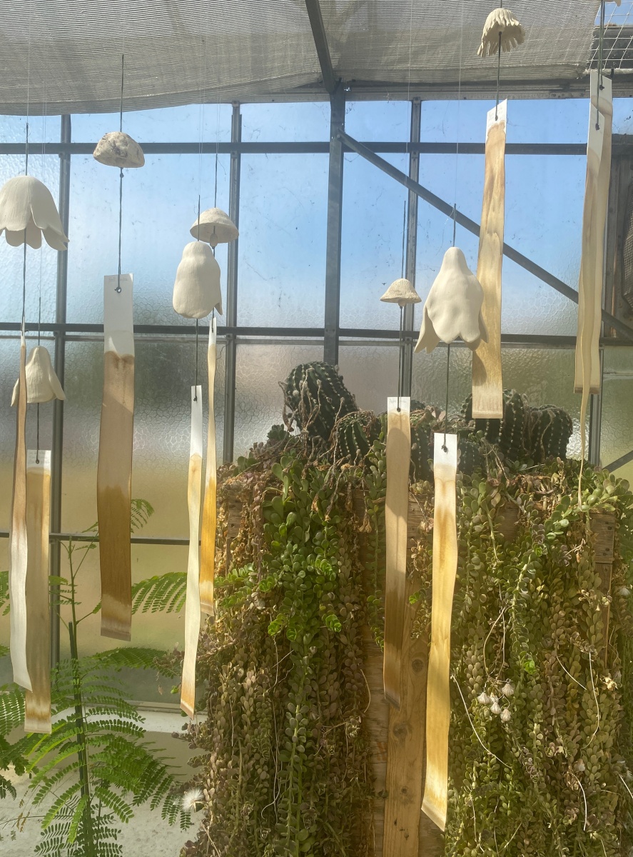 Karine Bonneval's installation, pétales sonnants, is a set of ceramic chimes, each in the shape of the petals of the flowers she visited. The flowers are picked very sparingly at the 5 selected stations along the transect, so as to minimise the number of samples taken in situ, but to allow the inhabitants of these soils to be seen and heard at all times of year. A chromatographic portrait is used to tint the plants in keeping with the soils in which they grow.