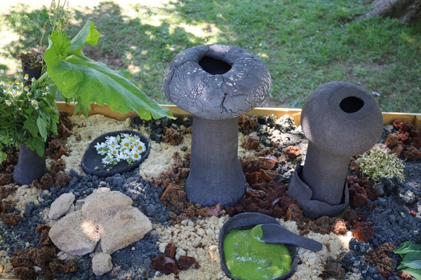 In Cahors, a sonorous and gustatory landscape is displayed in the square Jouvenel on a series of tables, inviting to a ceremonial gathering. Masters of ceremonies guide the ritual, offering to choose their black ceramic vessel to collect plots of small valleys of earth and wild plants. The soil, in complex and unexpected flavours, can be tasted, to the sound of the underground life of the ground emerging from the sculptures "listening to the soil". Traces of this strange ceremony, unique handmade pieces, the containers are offered for memory to the curious who will have eaten the soil.