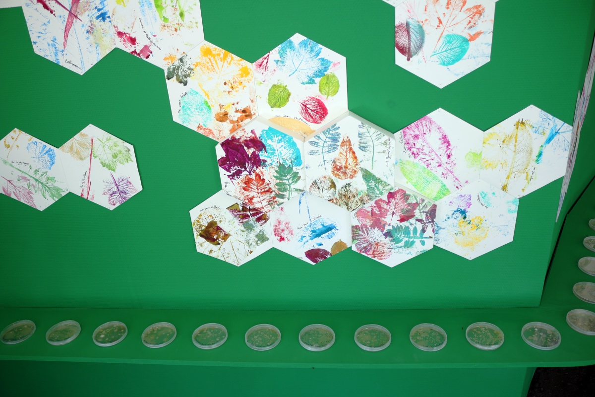 In order to get to know the vegetation of the neighbourhood's streets and gardens better, the artist created the Botanical Map of Bellejouanne. It has mobilized more than a hundred children and adults from the neighbourhood based on the natural herbarium model. This consisted in taking the imprint of a leaf pressed on a leaf by inking, as practiced by the naturalist Aimé Bonpland in the 19th century. Karine Bonneval presents these prints in the form of cellular alveolar interweaving by volume.