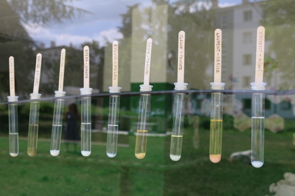 From the exchanges between Karine Bonneval and Laurence Héchard of the Ecole de l'ADN Nouvelle-Aquitaine was born Our DNA, crossing human DNA and DNA from fruits and vegetables, cherries, strawberries, apricots, spinach, cucumbers, tomatoes, raspberries...Based on a simple protocol that precipitates our DNA from saliva, nos ADN offers to mix us in vitro with a fruit or vegetable of our choice. In the test tubes, plant/human DNA mixtures are created, symbolically turning us into plants for the duration of the experiment.