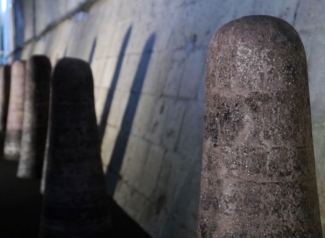 Makarka is an installation of 23 black tinted massaged sugar loaves. Their seductive glittering appearance does not completely mask the telluric side and reminding us that historically the sugar trade was based on triangular trade.