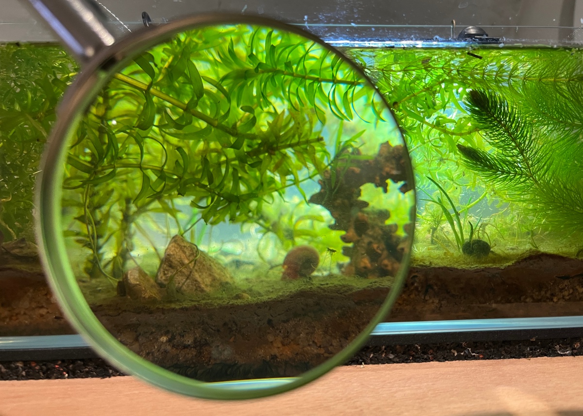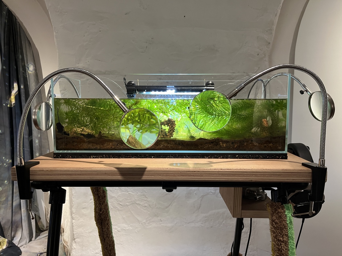 A small ecosystem taken from a pond in Orsay evolves in an aquarium. It contains plankton, composed of barely visible living organisms: this is the beginning of a balanced chain for plants and invertebrates that we often do not know about. They evolve before our eyes thanks to magnifying glasses, swimming, crawling, digging, and invading habitats in the form of microscopic organisms built especially for them. We listen to their movements through a hydrophone, and we can also listen live to the sounds produced by our digestive system. Human sounds and the sounds of aquatic life mix together, broadcast through speakers.