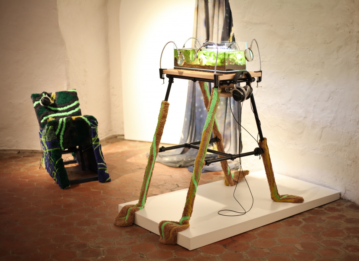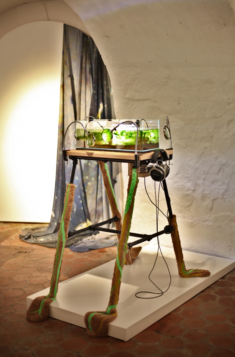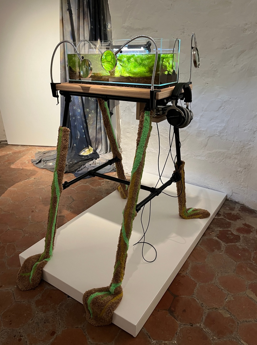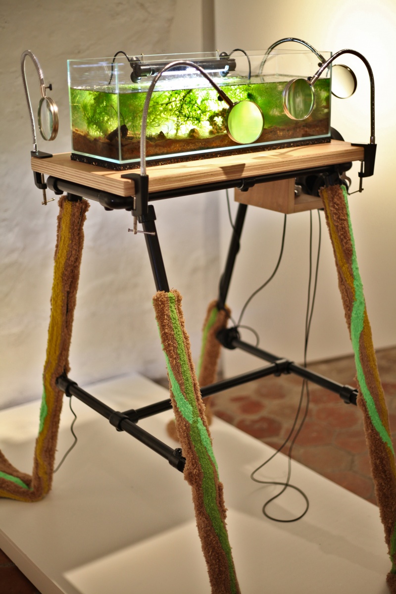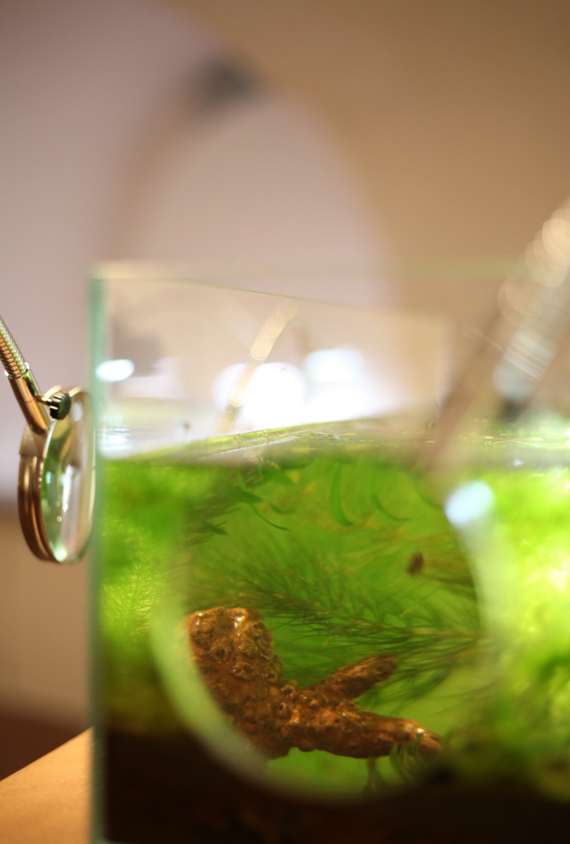 Dans un aquarium évolue un petit écosystème prélevé dans une mare d’Orsay. On y trouve de plancton, composé d’organismes vivants à peine visibles : c’est le début d’une chaine équilibrée pour des plantes et invertébrés que l’on ne connaît souvent pas. Ils évoluent sous nos yeux grâce à des loupes, nagent, rampent, creusent, investissent des habitats en forme d’organismes microscopiques et construits spécialement pour eux. Nous les écoutons leurs évolutions grâce à un hydrophone, on peut également d’écouter en direct les sons produits par notre système digestif. Les sons humains et du vivant aquatique se mélangent, diffusés dans des enceintes.