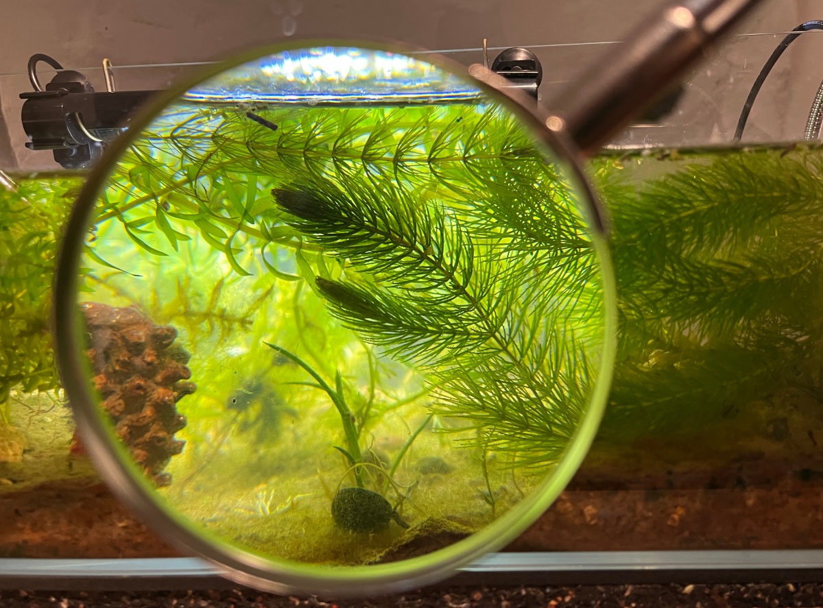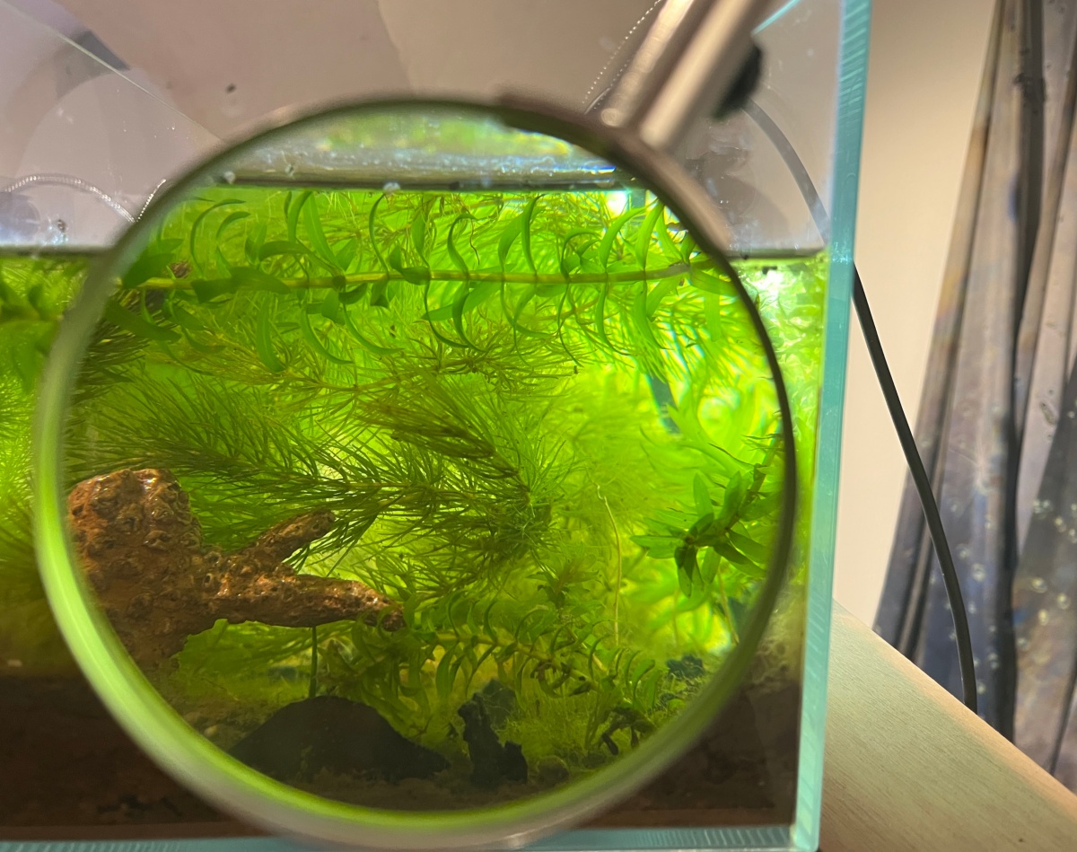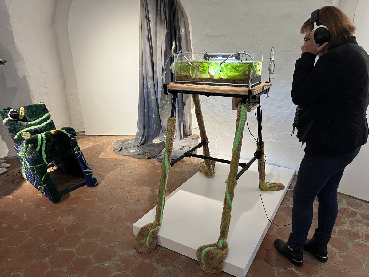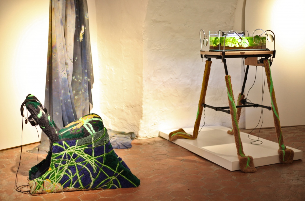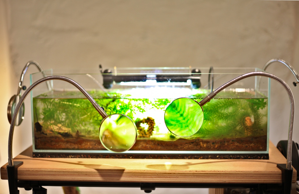 Dans un aquarium évolue un petit écosystème prélevé dans une mare d’Orsay. On y trouve de plancton, composé d’organismes vivants à peine visibles : c’est le début d’une chaine équilibrée pour des plantes et invertébrés que l’on ne connaît souvent pas. Ils évoluent sous nos yeux grâce à des loupes, nagent, rampent, creusent, investissent des habitats en forme d’organismes microscopiques et construits spécialement pour eux. Nous les écoutons leurs évolutions grâce à un hydrophone, on peut également d’écouter en direct les sons produits par notre système digestif. Les sons humains et du vivant aquatique se mélangent, diffusés dans des enceintes.