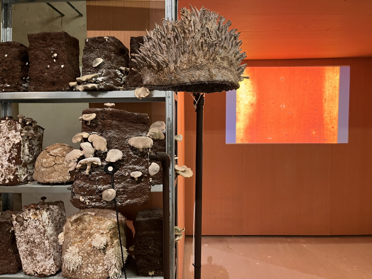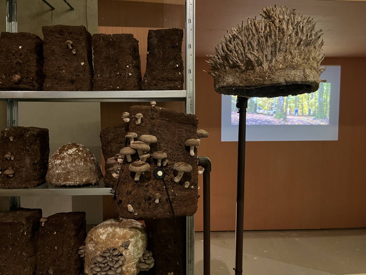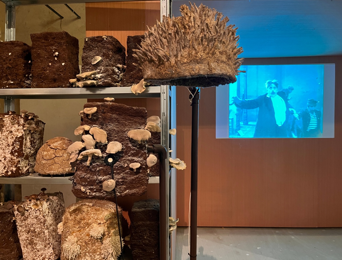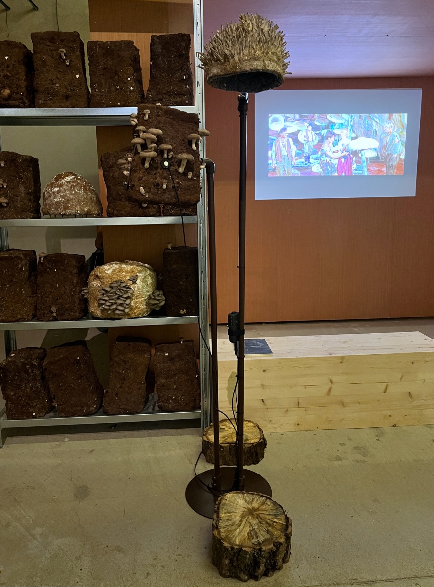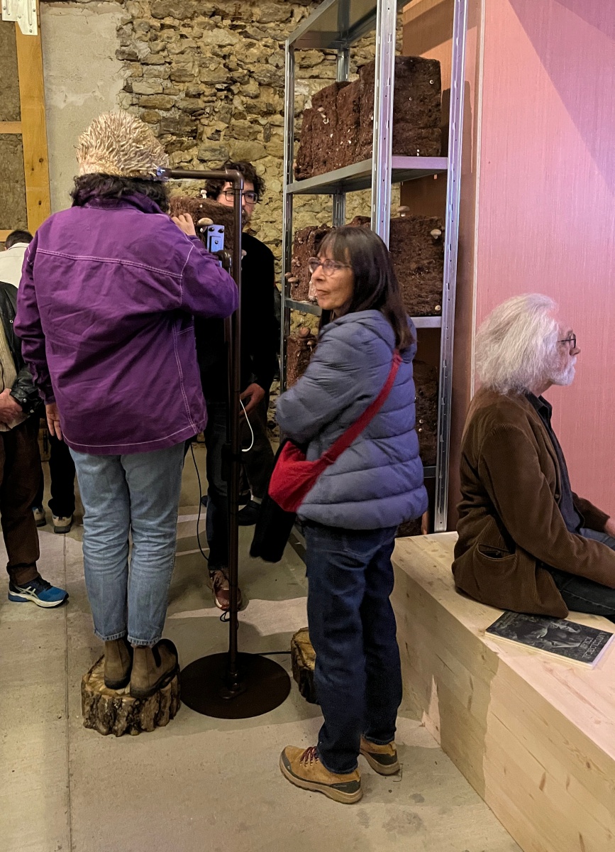 Entre les blocs de culture de pleurotes et de shiitakés de Zoltán Babos, Karine Bonneval déploie des protocoles d’écoute et d’apprivoisement mutuel. S’inspirant de John Cage, mycologue passionné et compositeur reconnu, elle enregistre les infimes variations sonores qui traversent les substrats de paille tout en diffusant aux champignons des compositions expérimentales. Cette recherche sur les notions d’aramu et d’ikiamia – le cultivé par les humains versus le cultivé par les esprits, selon les Achuar – questionne nos catégories de domestique et de sauvage. Les blocs de culture « libérés » dans la prairie deviennent les témoins d’un ensauvagement contrôlé, tandis que des casques ensemencés de mycélium invitent les visiteur·euse·s à une immersion dans l’univers acoustique fongique. La vidéo Kino Grib de Marc Plas s’intégre et dialogue avec l’installation de Karine, les champignons y apparaissent révélant la place singulière qu’occupent les fungi dans notre imaginaire cinématographique.