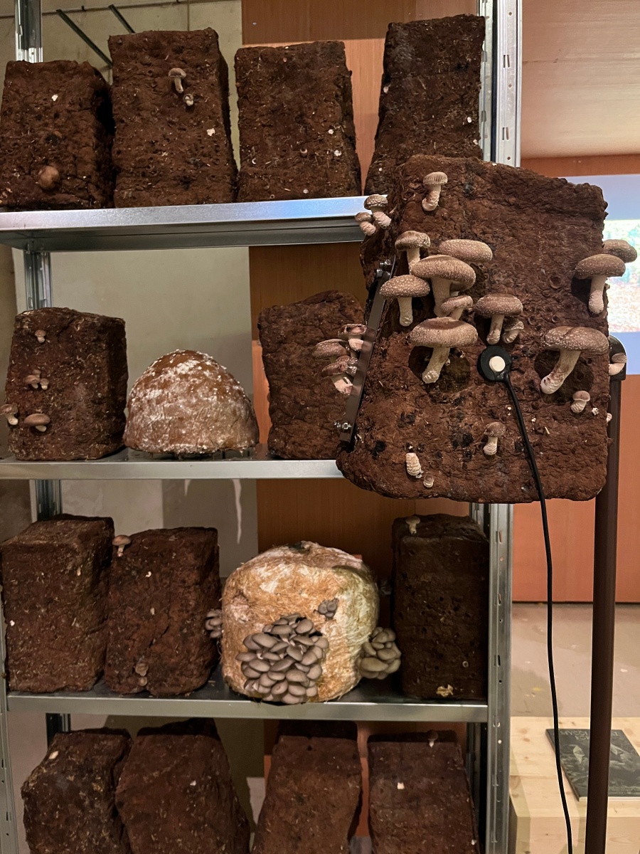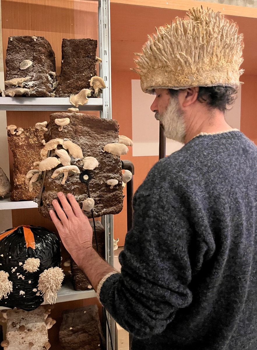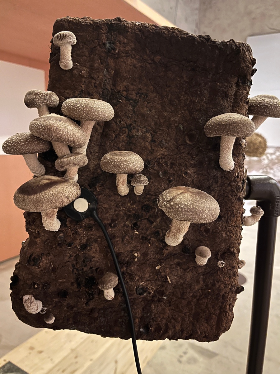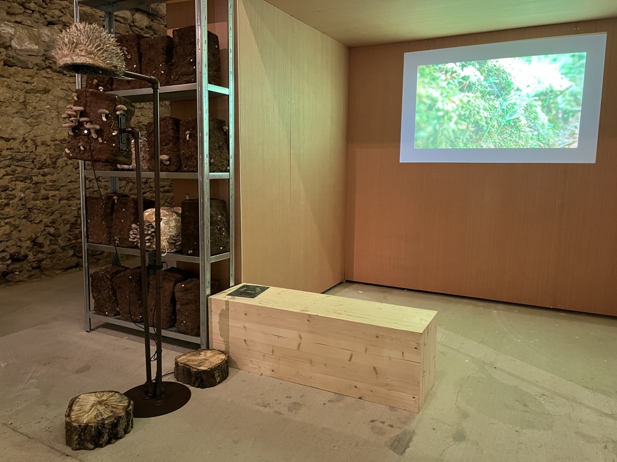Entre les blocs de culture de pleurotes et de shiitakés de Zoltán Babos, Karine Bonneval déploie des protocoles d’écoute et d’apprivoisement mutuel. S’inspirant de John Cage, mycologue passionné et compositeur reconnu, elle enregistre les infimes variations sonores qui traversent les substrats de paille tout en diffusant aux champignons des compositions expérimentales. Cette recherche sur les notions d’aramu et d’ikiamia – le cultivé par les humains versus le cultivé par les esprits, selon les Achuar – questionne nos catégories de domestique et de sauvage. Les blocs de culture « libérés » dans la prairie deviennent les témoins d’un ensauvagement contrôlé, tandis que des casques ensemencés de mycélium invitent les visiteur·euse·s à une immersion dans l’univers acoustique fongique. La vidéo Kino Grib de Marc Plas s’intégre et dialogue avec l’installation de Karine, les champignons y apparaissent révélant la place singulière qu’occupent les fungi dans notre imaginaire cinématographique.