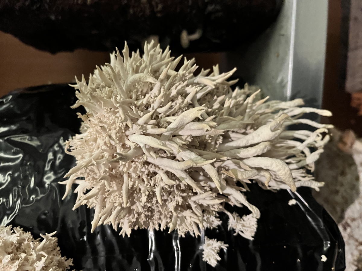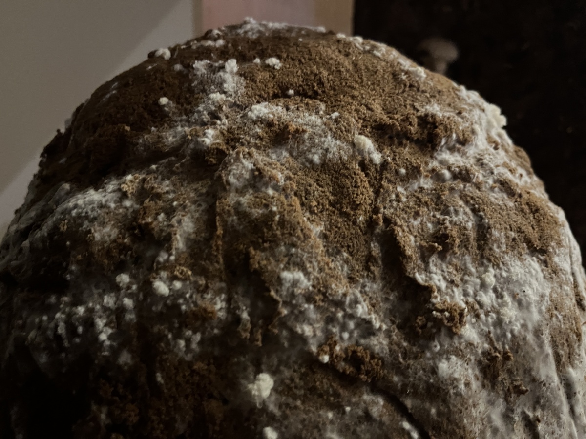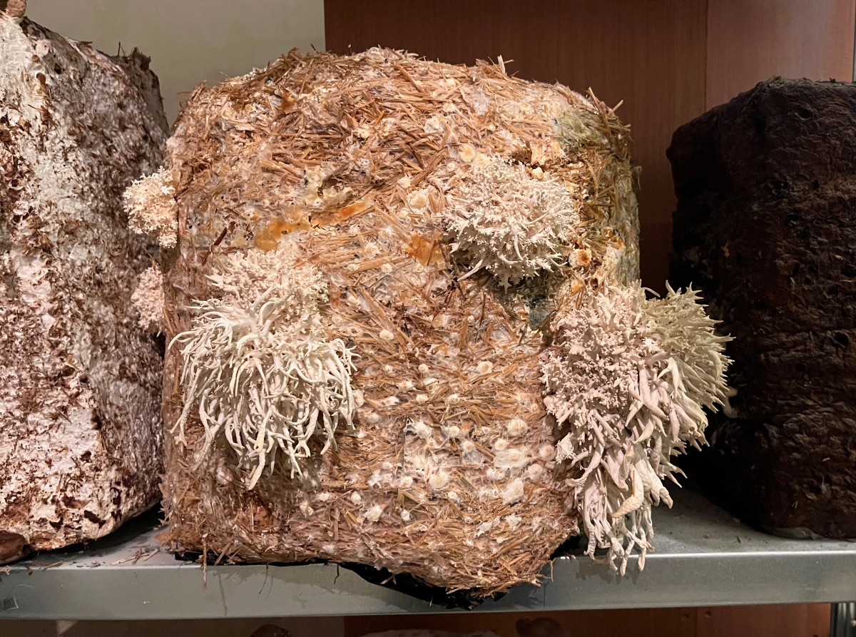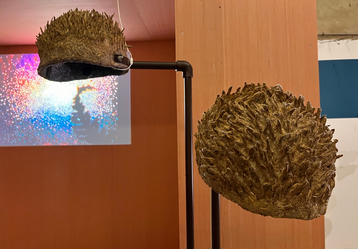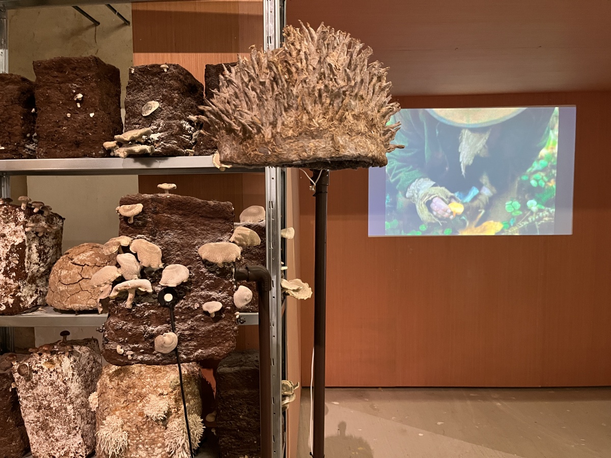 Entre les blocs de culture de pleurotes et de shiitakés de Zoltán Babos, Karine Bonneval déploie des protocoles d’écoute et d’apprivoisement mutuel. S’inspirant de John Cage, mycologue passionné et compositeur reconnu, elle enregistre les infimes variations sonores qui traversent les substrats de paille tout en diffusant aux champignons des compositions expérimentales. Cette recherche sur les notions d’aramu et d’ikiamia – le cultivé par les humains versus le cultivé par les esprits, selon les Achuar – questionne nos catégories de domestique et de sauvage. Les blocs de culture « libérés » dans la prairie deviennent les témoins d’un ensauvagement contrôlé, tandis que des casques ensemencés de mycélium invitent les visiteur·euse·s à une immersion dans l’univers acoustique fongique. La vidéo Kino Grib de Marc Plas s’intégre et dialogue avec l’installation de Karine, les champignons y apparaissent révélant la place singulière qu’occupent les fungi dans notre imaginaire cinématographique.