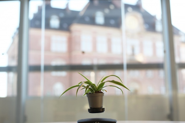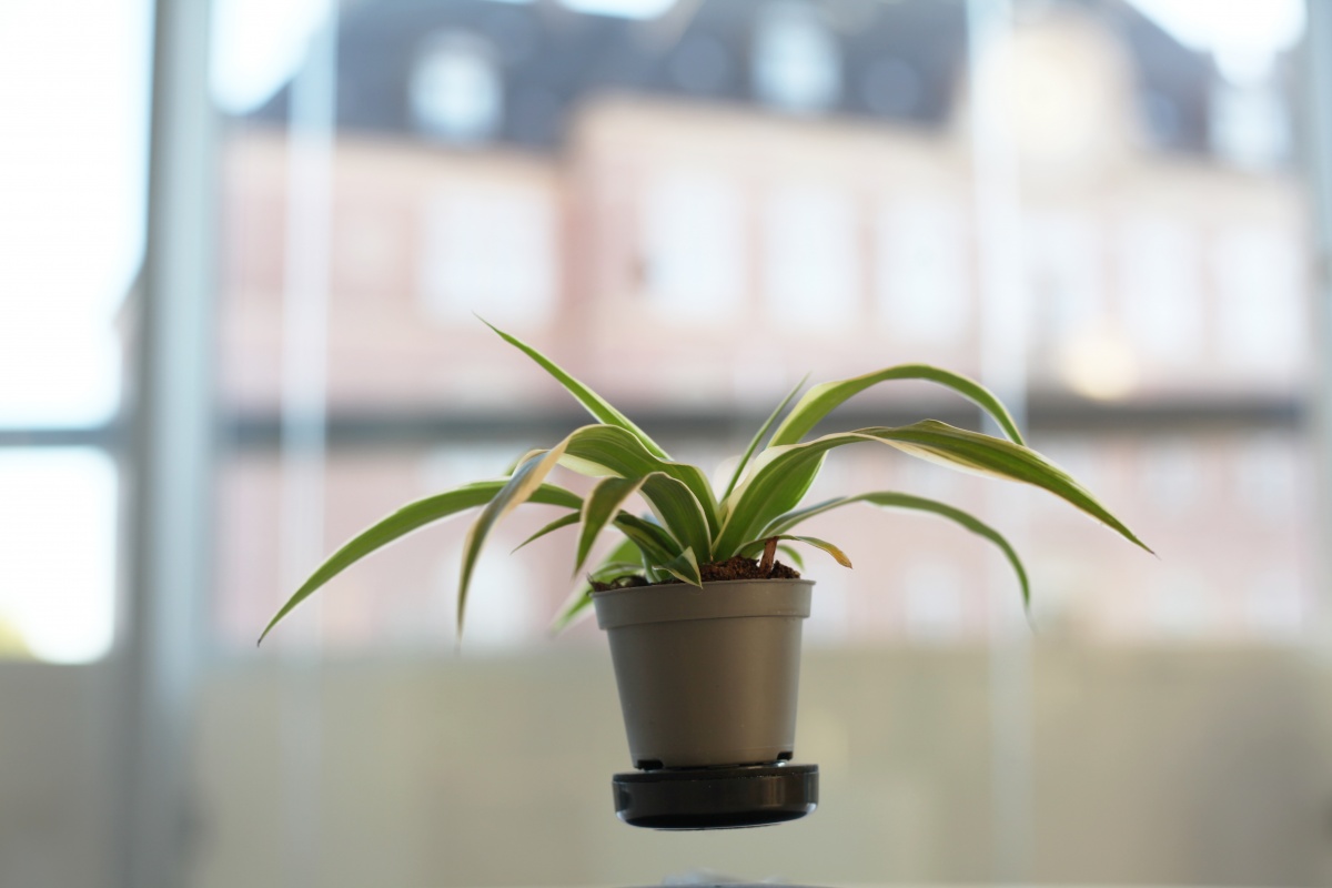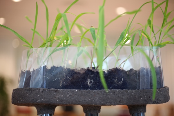 Dans cette pièce partiellement transparente, 3 enceintes diffusent, via trois tubes remplis de terre, trois types de sons aux systèmes racinaires : un grondement d'éléphant, un morceau de harpe et un son de l‘activité d’invertébrés dans le sol.